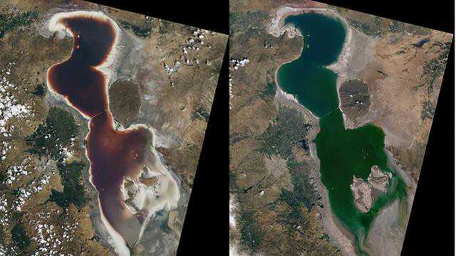 2021年7月6日,伊朗乌鲁米耶湖由于干旱面临干涸而变得血红一片