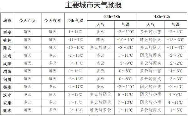19日:全省阴天,陕北、关中北部、商洛和秦巴山区有小雪,关中南部、汉中和安康有雨夹雪或小雪。