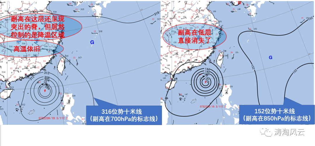 但在上图中我们看到,700hPa层(约海拔3公里)副高在大陆的区域已经弱了很多,残留一个脊区。而这残留的副高最强区,居然恰好对应着高温结束的区域,反之在其南侧没有在副高内的区域,恰恰是高温依旧肆虐的区域。