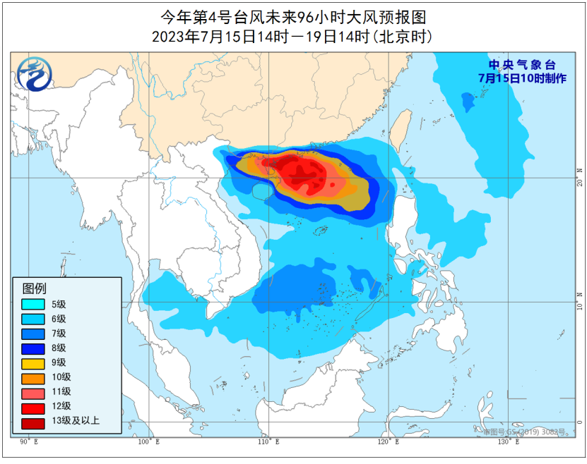 降雨预报:预计16日至19日,受台风及外围环流影响,华南大部及云南南部、湖南南部、江西、福建南部、安徽北部和东部、江苏南部等地有大雨或暴雨,其中广东南部、海南岛、广西南部等地的部分地区有大暴雨,广东西南部沿海、海南岛中北部、广西南部沿海局地有特大暴雨;累计降雨量120~200毫米,局地可达250~450毫米;降雨期间伴有雷电、短时强降雨和局地雷暴大风等强对流天气,最大小时降雨量30~60毫米,局地70毫米以上。最强降雨时段在17日至18日。