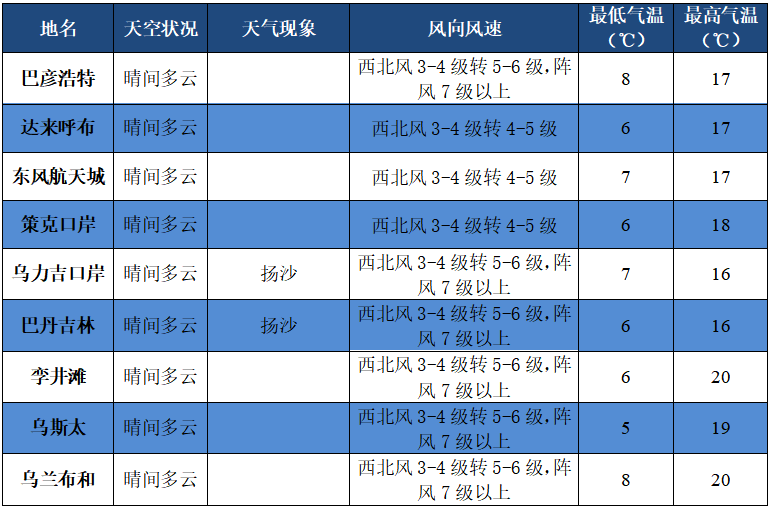 阿左旗偏北部阵风6-7级,有扬沙