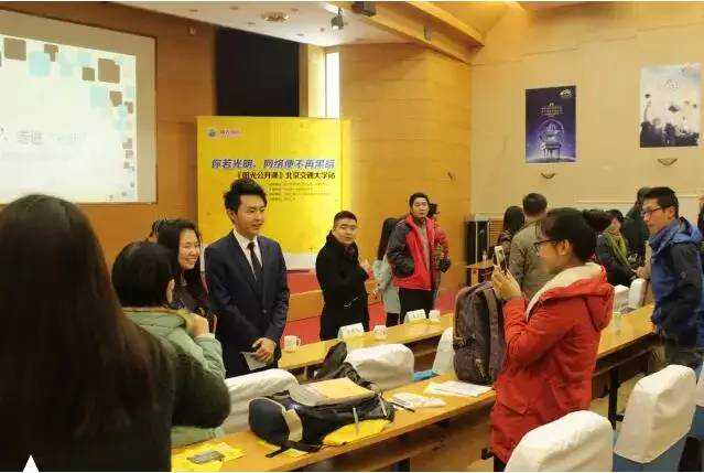 北京交通大学公开课后,有粉丝和宣传大使梁植哥哥合影,笑不拢嘴的她表示,就这个feel倍儿爽。一旁工作人员只能羡慕、jidu、恨。。。
