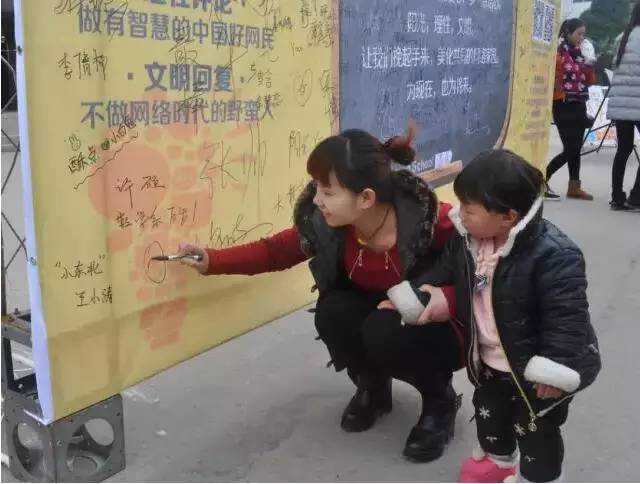 河南商丘,一位带着宝宝的美丽妈妈正在署名板上“画画”。文明需要传承,小姐姐拯救世界就靠你了。