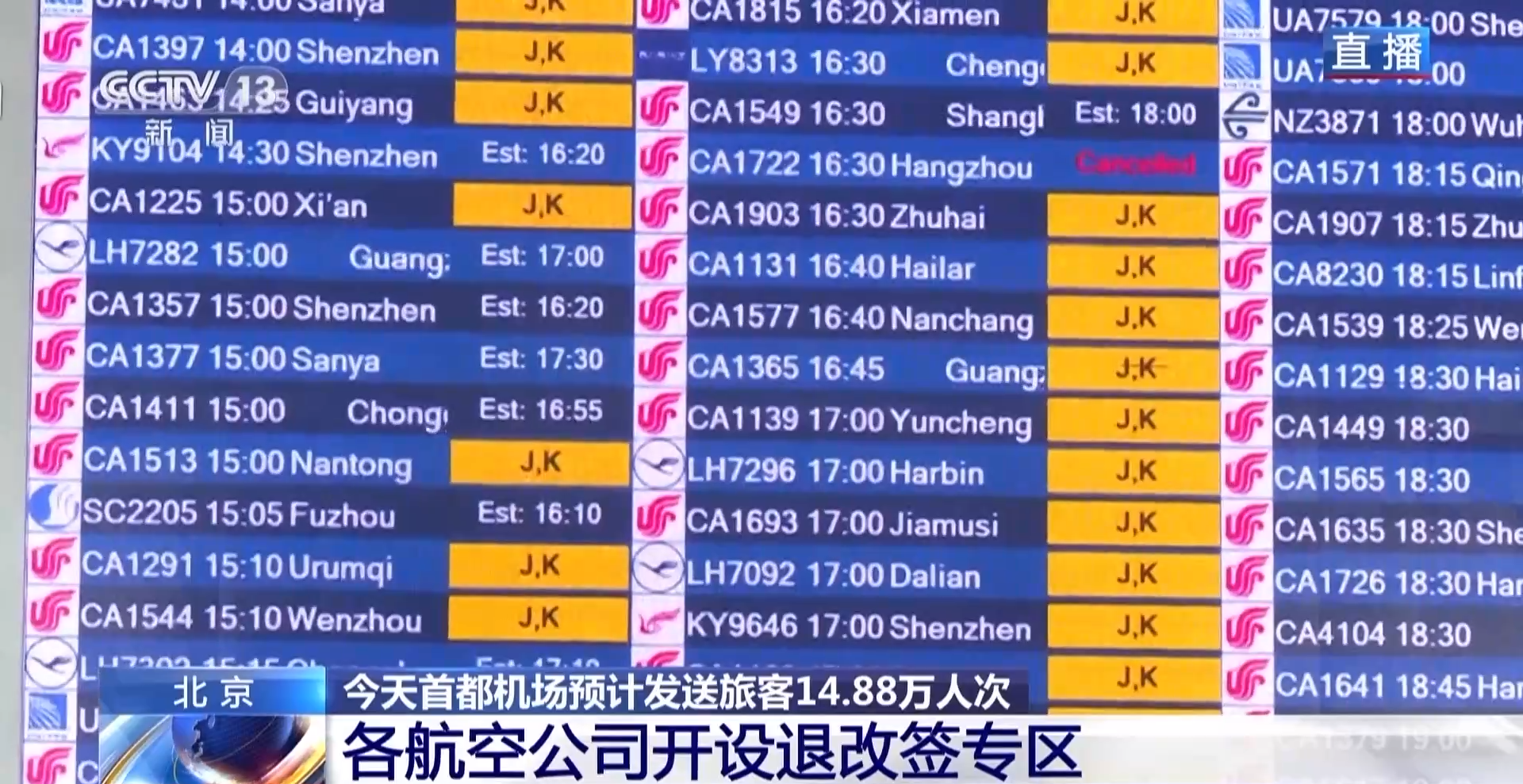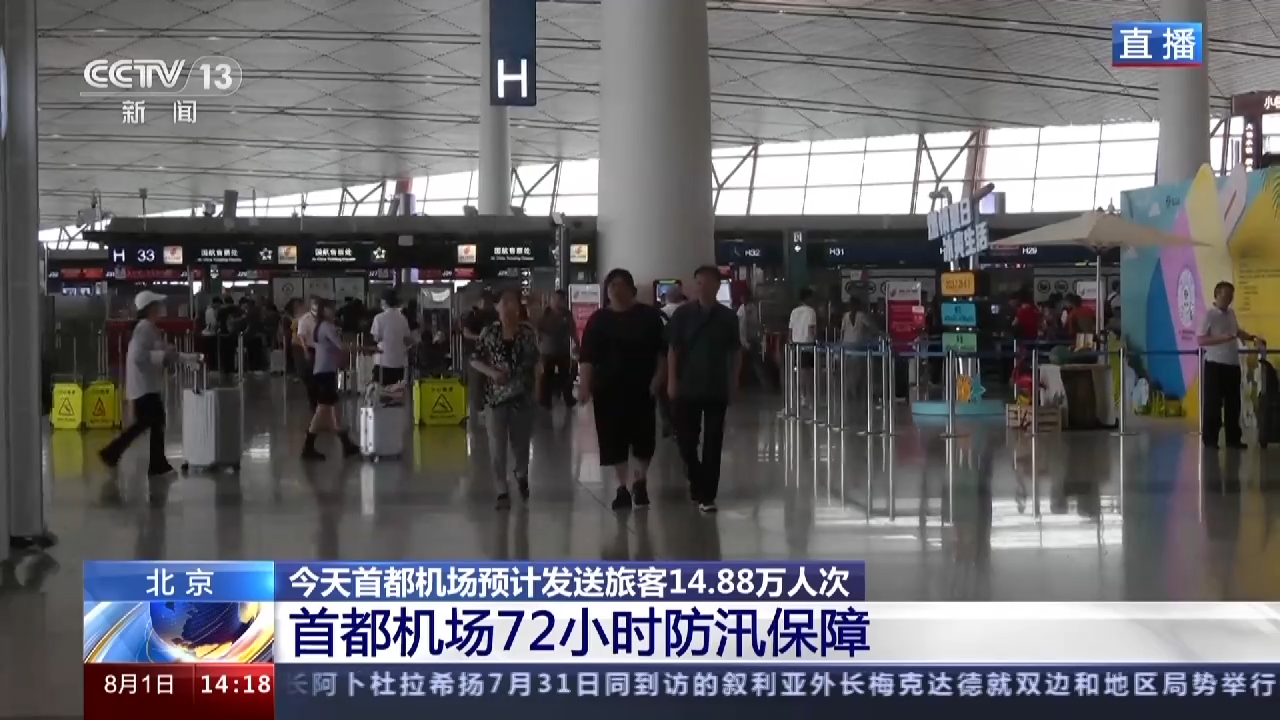 总台央视记者唐颖:和今天(8月1日)上午国内旅客集中出发不同的是,从下午1时开始,国际港澳台出发的旅客陆续增多。首都机场今天计划运送旅客14.88万人次,保障航班1137架次。截至14时,首都机场已执行航班500架次,取消36架次。