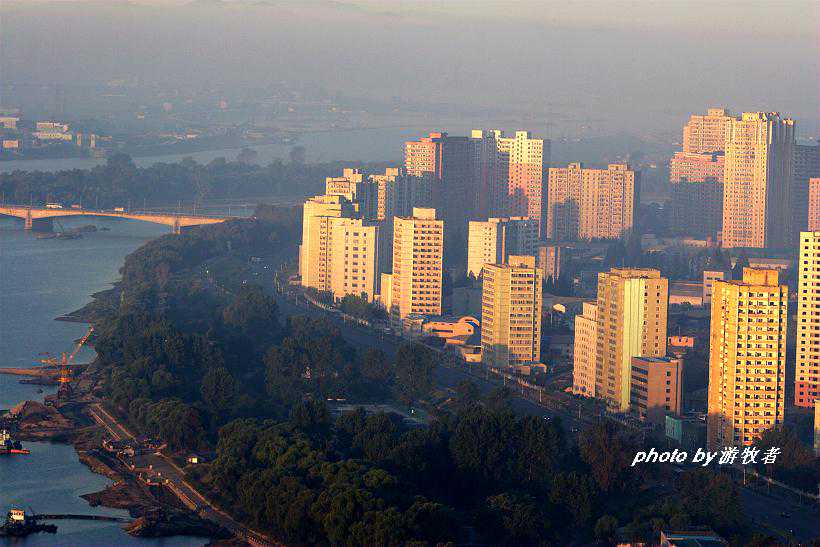 把镜头对准大同江的西岸,也就是朝鲜人所说的平壤西区,这里主要是朝鲜的政治中心、商业中心和平壤市民的主要居住区。平壤最繁华的地方都位于朝鲜的西区。仔细看这里似乎有一层薄薄的烟雾。