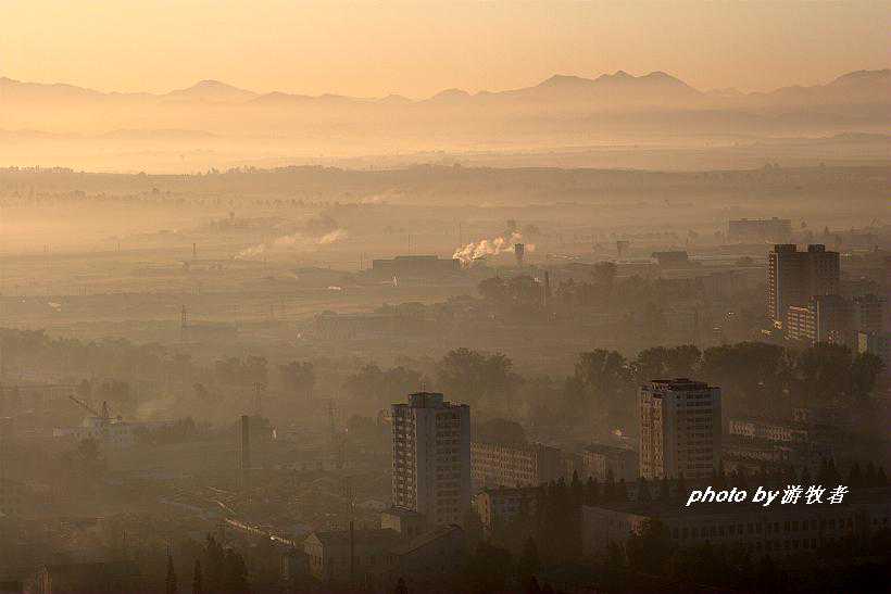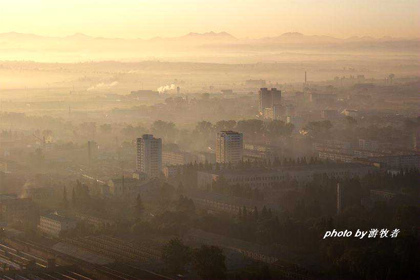 在清晨的羊角岛酒店俯瞰平壤,可以发现上一层烟雾笼罩在平壤的上空,这究竟是雾还是人们传说中的雾霾呢?