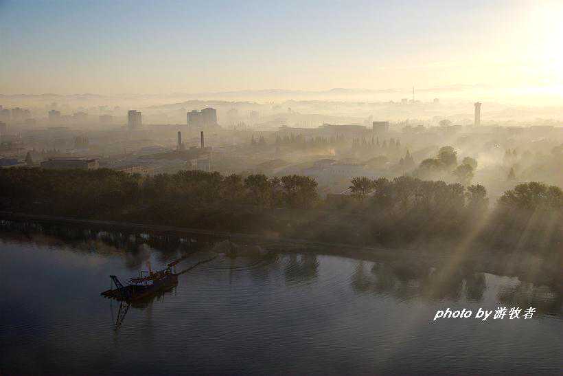 只过了一会的功夫,江上的雾气便渐渐散去,大同江畔的建筑在我的眼前逐渐清晰起来。雾和雾霾还有一个显著的区别,就是雾具有局地性、短时间的特点,多发生在夜间和清晨,随着时间的推移会减弱消散。而雾霾有一个逐渐形成的过程,形成后会持续数日。