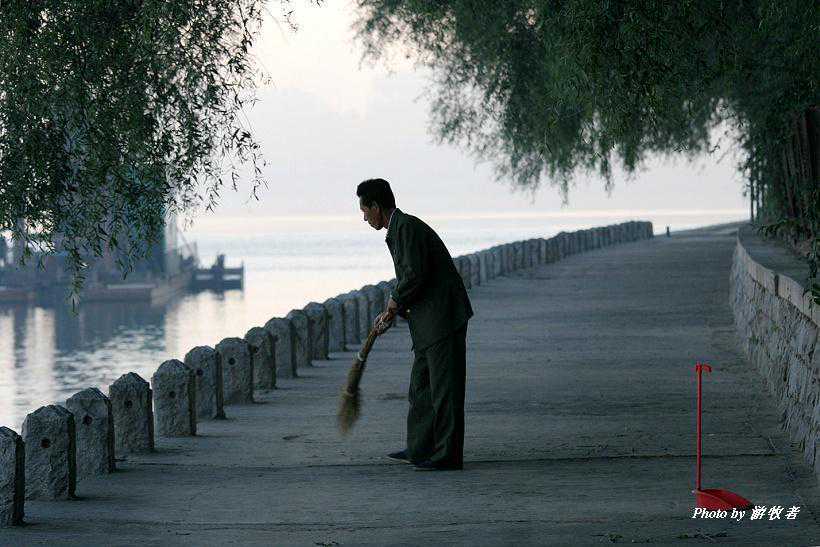 一位清洁工正在仔细地打扫宾馆的院子,连一片落叶都不放过。今天平壤的人均绿地面积已经达到了58平方米,花草遍地,空气清新,被誉为“花园城市”。这样的城市真的会有雾霾吗?你怎么看?