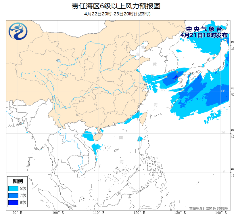 21日夜间至22日白天,黄海大部海域、东海大部海域将有6~7级、阵风8级的偏北风或东北风,其中东海东北部海域的风力可达8级、阵风9级。为此,中央气象台21日18时继续发布《海上大风预报》。
