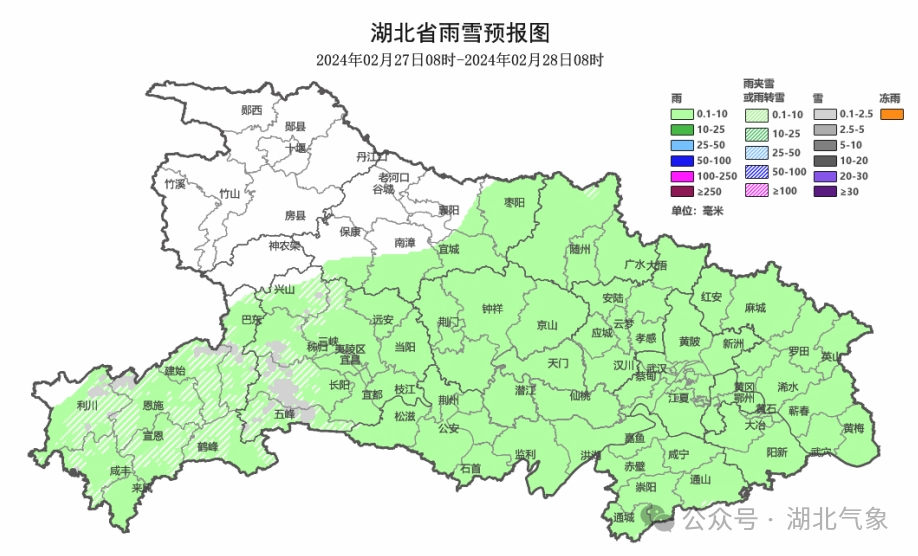 27日08时-28日08时,鄂西北多云到阴天;其他地区阴天转小雨,其中鄂西南局部有雨夹雪或小雪。最高气温大部地区4~8℃,最低气温大部地区-2~2℃。偏北风2到3级。