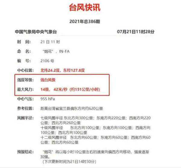 据中央气象台消息,截止21日11时,“烟花”已经升级为14级强台风,中心距离台湾省宜兰县偏东方向约620公里,未来“烟花”将以每小时10公里左右的速度向偏西方向移动,强度逐渐加强。