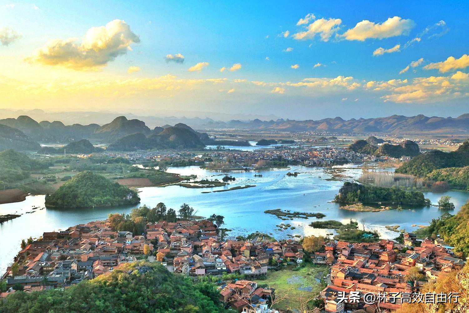 从仙人洞山山顶俯瞰普者黑,果然是一幅壮丽的喀斯特山水画。远山如黛,金色光柱从天而降,天地间,万物同沐光辉,美得如梦如幻,果然是“人间的青丘”。