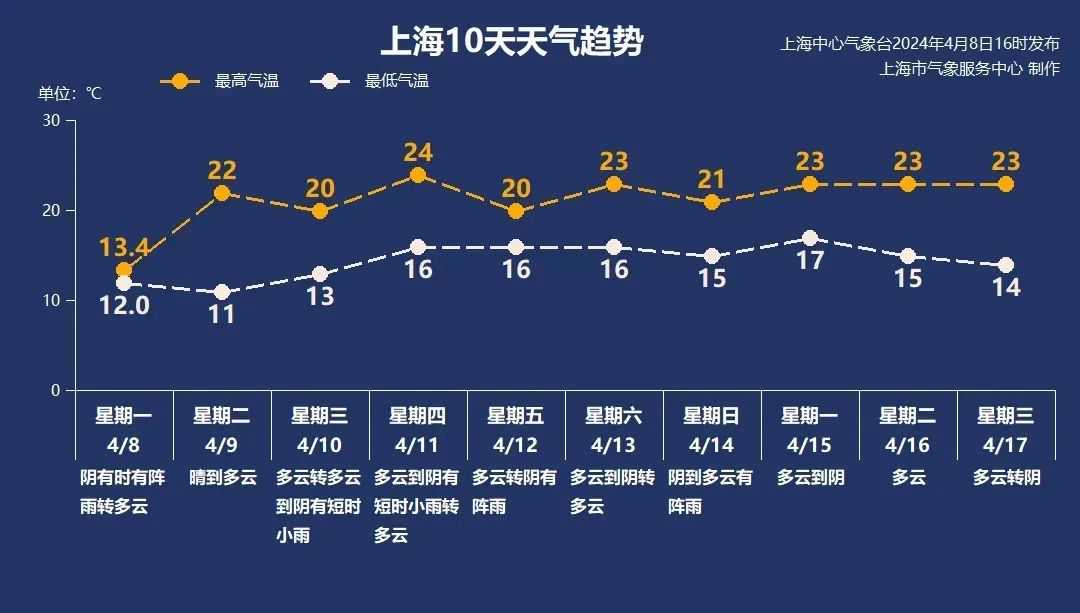 上海本周中后期,短波槽活动频繁,仍多降水过程,其中12日和14日前后降水较明显。明天起,上海的最高气温将稳居“2”字头,基本在20~24℃之间,白天重回暖意融融的体感。