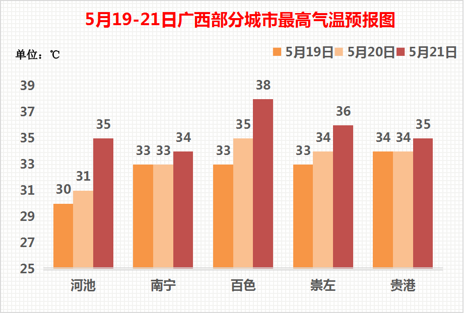5月20日~21日,玉林全市多云间阴天、局部地区午后有雷阵雨,最低气温24℃~26℃,最高气温34℃~36℃,偏南风1~2级。