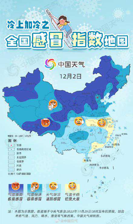 11月30日,冷空气快速南下,南方将成为降温的重心,贵州东部、湖南、江西西部、湖北东部、安徽中南部、江苏南部、浙江中北部等地降温幅度普遍在10℃以上,局地接近15℃,犹如“一日穿越两季”,这一带地区将与天寒风大的内蒙古、西藏等地一同成为极易感冒区域;与此同时,北方大部地区气温仍低迷,这一天全国绝大多数地区的感冒气象指数将较高,大家需重点防护。