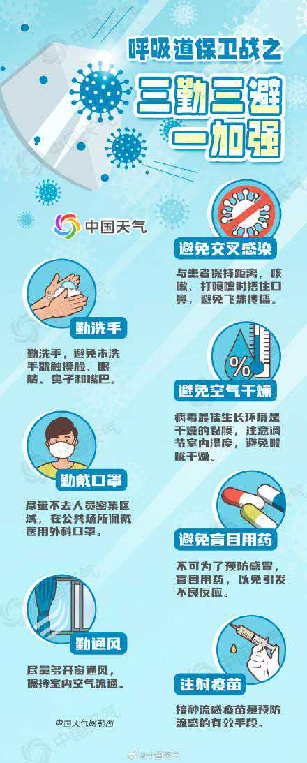 谨记“三勤三避一加强”打响呼吸道保卫战国家流感中心发布的监测显示,截至11月19日,南北方多地流感病毒检测阳性率持续上升,高于2020至2022年同期水平。目前,我国各地呼吸道疾病高发,病毒类型复杂,加上秋冬季节冷空气活动频繁,在气温陡降时,更容易感冒。那么,大家在日常生活中该如何预防呢?牢记“三勤三避”原则,科学预防感冒。