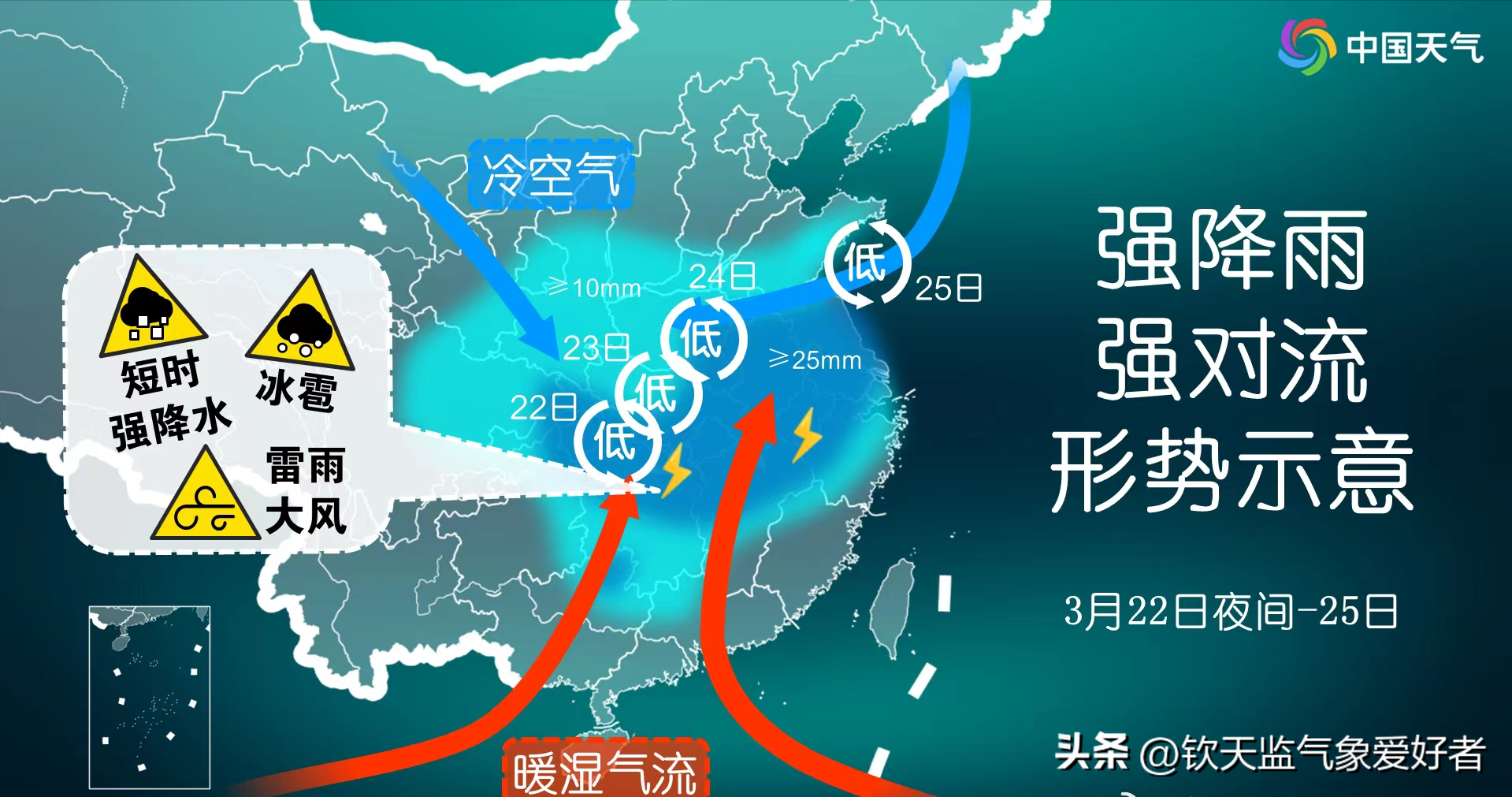 今年以来最大范围降水即将开启根据最新的气象预测意见,22-25日,冷空气将兵分两路南下:西路从新疆、甘肃、宁夏东移南下;东路从东北地区南下,在山东、江苏向西回流进入中原地区。与此同时,暖湿气流也兵分两路北上:南支槽驱动印度洋水汽从中南半岛进入我国云南、广西等地并向北长驱直入,副高西侧边缘的偏南暖湿气流从华南地区上岸,两股暖湿气流直达长江中下游地区。