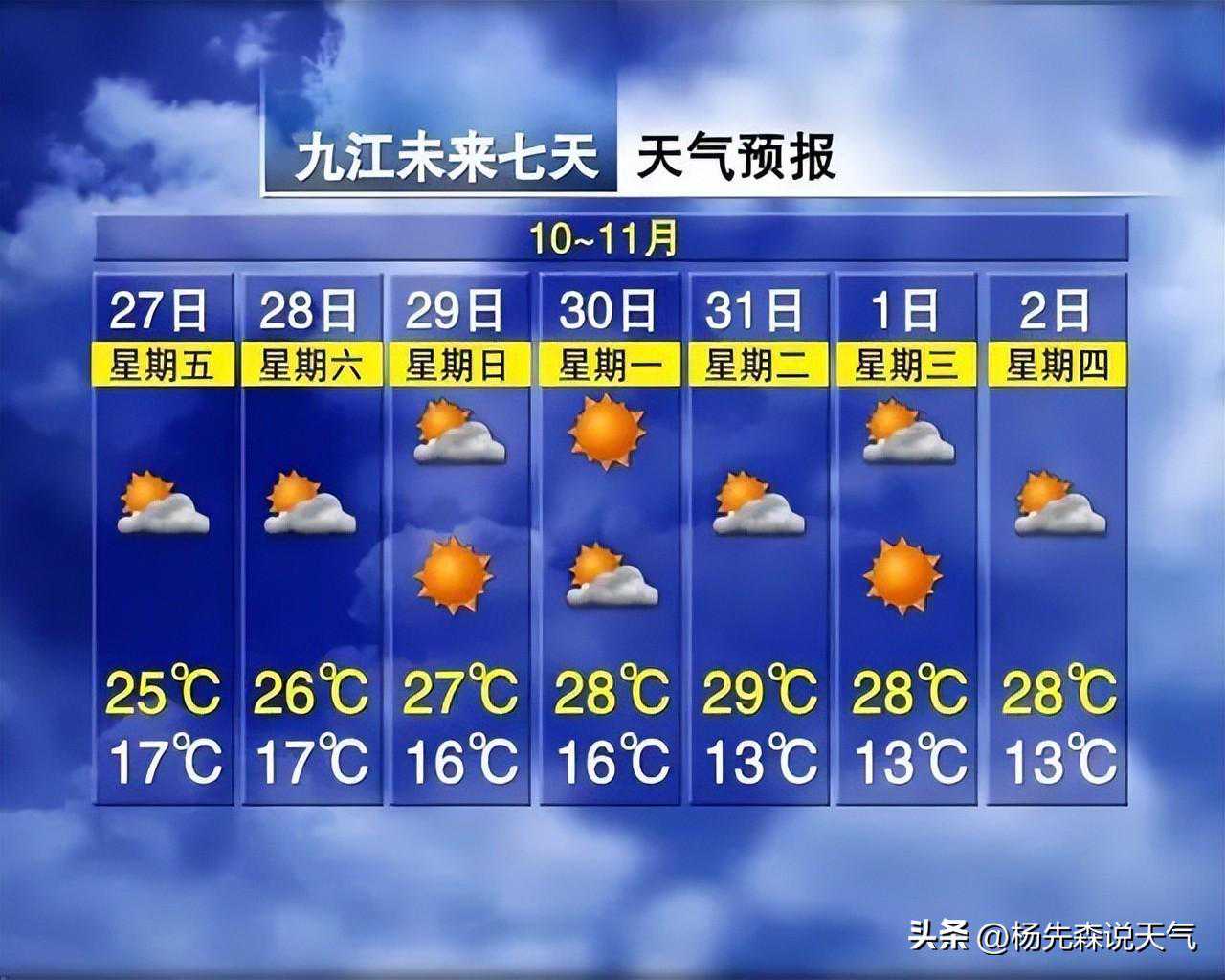 全媒记者的报道,今天,九江地区将迎来多云天气,部分山区早晨可能会有雾。明天,阴天和多云天气将交替出现,而后天,九江市将在阴天和多云之间度过。而在30日,我省东部和南部地区将经历阴天逐渐变为多云的过程,部分地区可能会有小雨。而全省其他地区则将迎来多云天气逐渐晴朗。而自10月31日至11月3日,全省预计将以晴天和多云为主。