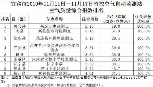 宜宾空气质量综合指数排名(11月11日—11月17日)