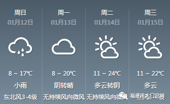 漳州市气象台1月10日16时6分发布全市天气:12日:阴有小雨;13日:小雨转多云。市区天气:12日:阴转小雨,气温13~18℃;13日:小雨转多云,气温13~20℃。