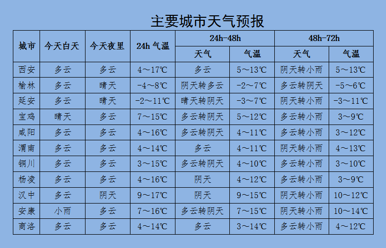 21日:小雨转阴天,秦岭山区有雨夹雪,3℃~7℃。