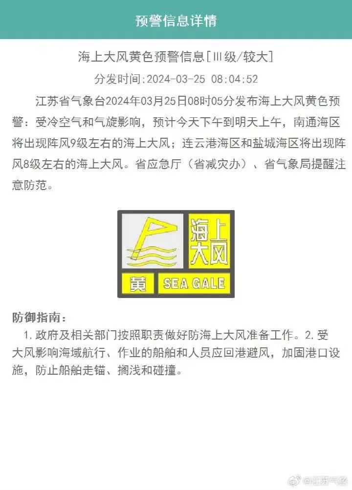 江苏省气象台2024年03月25日08时05分发布海上大风黄色预警: