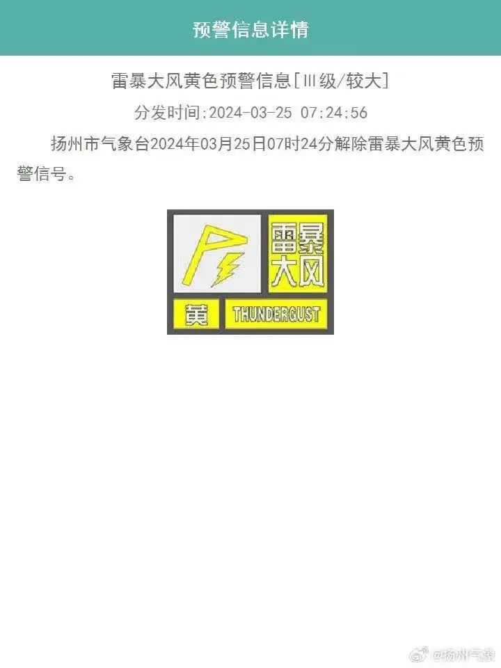 扬州市气象台2024年03月25日07时24分解除雷暴大风黄色预警信号。