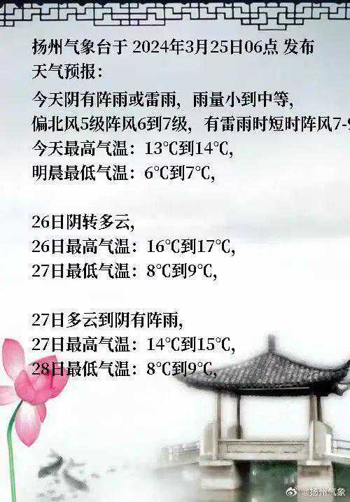 【扬州气象短期预报】今天阴有阵雨或雷雨,雨量小到中等,偏北风5级阵风6到7级,有雷雨时短时阵风7-9级,今天最高气温:13℃到14℃,明晨最低气温:6℃到7℃。