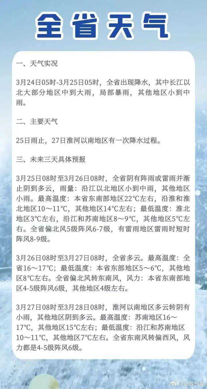 【25日雨止,27日淮河以南地区有一次降水过程。】3月25日08时至3月26日08时,全省阴有阵雨或雷雨并渐止阴到多云,雨量:沿江以北地区小到中雨,其他地区小雨。最高温度:本省东南部地区22℃左右,沿淮和淮北地区10~11℃,其他地区14℃左右;最低温度:淮北地区3℃左右,沿江和苏南地区8~9℃,其他地区5℃左右。全省偏北风5级阵风6-7级,有雷雨地区雷雨时短时阵风8-9级。