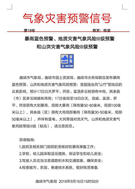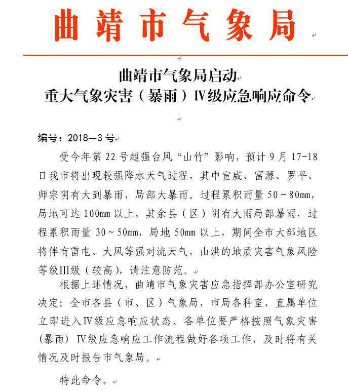 今年第22号台风“山竹”于16日17时前后在广东台山沿海登陆,为今年以来登陆我国的最强台风。受其北部云系影响,17日夜间至18日我市多地将有强降雨。预计17日白天,罗平、师宗阴有中雨,其余县(市、区)多云有阵雨;17日夜间至18日白天,富源南部、罗平、师宗阴有大到暴雨,局部大暴雨(降雨量50-80毫米,局部100毫米以上),其余县(市、区)阴有大雨局部暴雨(降雨量30-50毫米,局部50毫米以上),并伴有雷电、大风等强对流天气,易发生山洪和地质灾害。