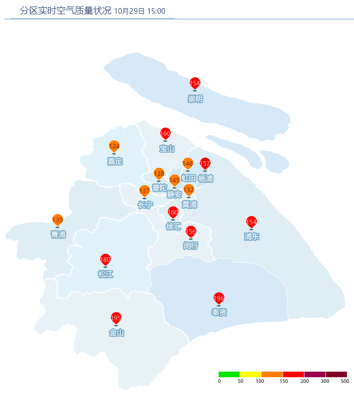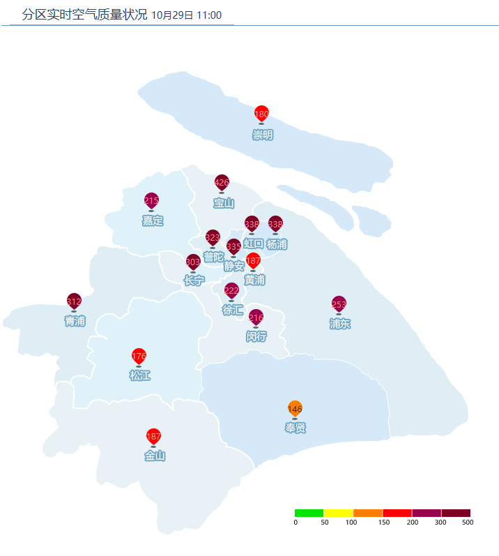 静安监测站、浦东川沙监测站、浦东张江监测站、浦东监测站等监测站点的实时空气质量指数均超过300,达到严重污染。分区实时空气质量指数显示,11时左右,宝山达到了426,虹口和杨浦为338,均处于严重污染状态。