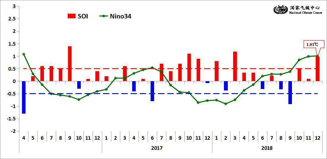 目前的海洋是什么样的情况呢?国家气候中心指出,赤道中东太平洋已经在2018年9月进入厄尔尼诺状态。10、11、12月Niñ区海温指数分别为0.85、0.99、1.01℃,10-12月三个月滑动平均为0.95℃。根据赤道太平洋海洋大气近期演变特征以及国内外多家气候动力和统计模式预测,未来赤道中东太平洋海温将继续处于偏暖状态,预计2018/2019年冬季赤道中东太平洋将形成一次厄尔尼诺事件。