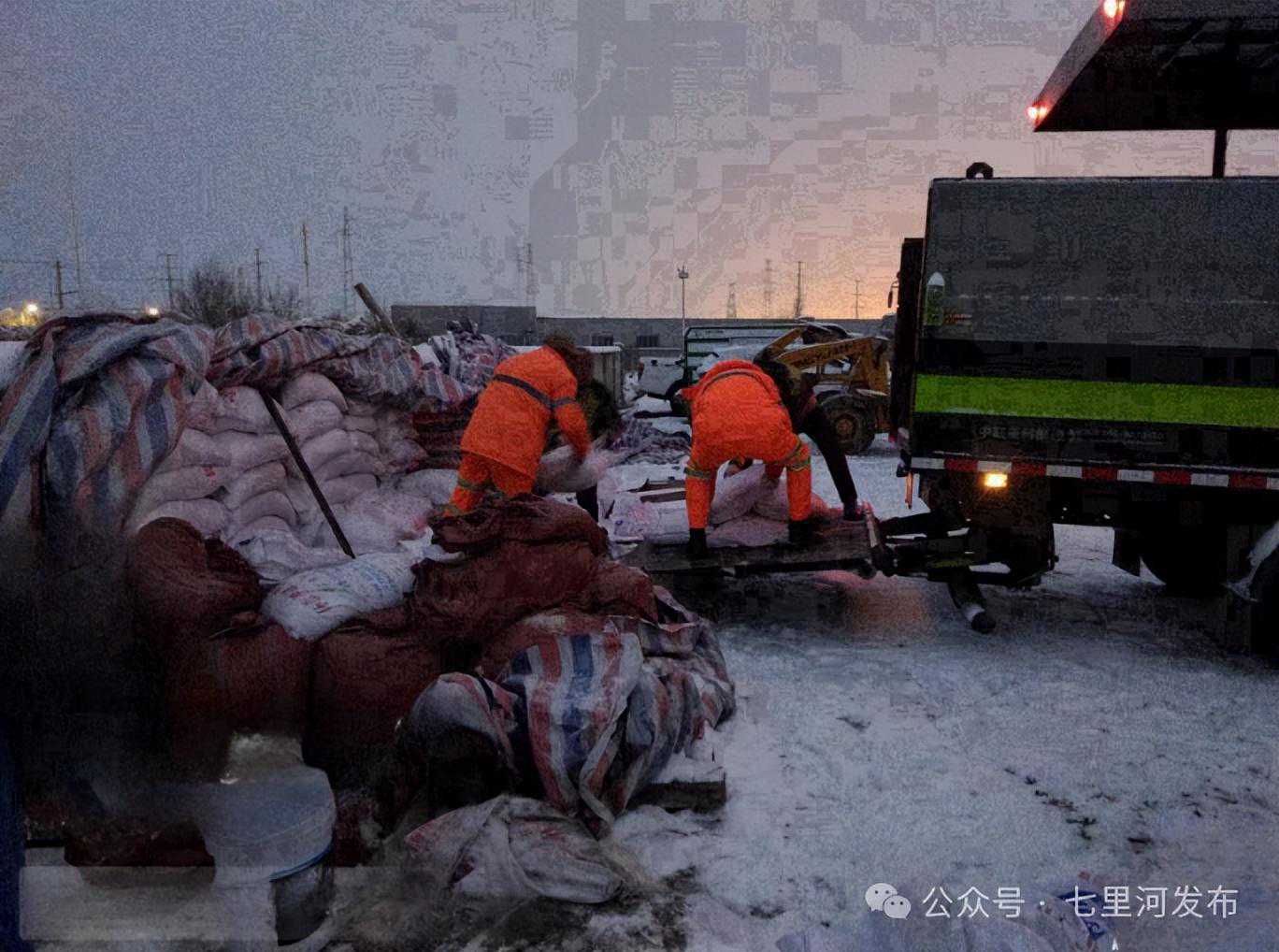 工作人员正在装卸融雪剂