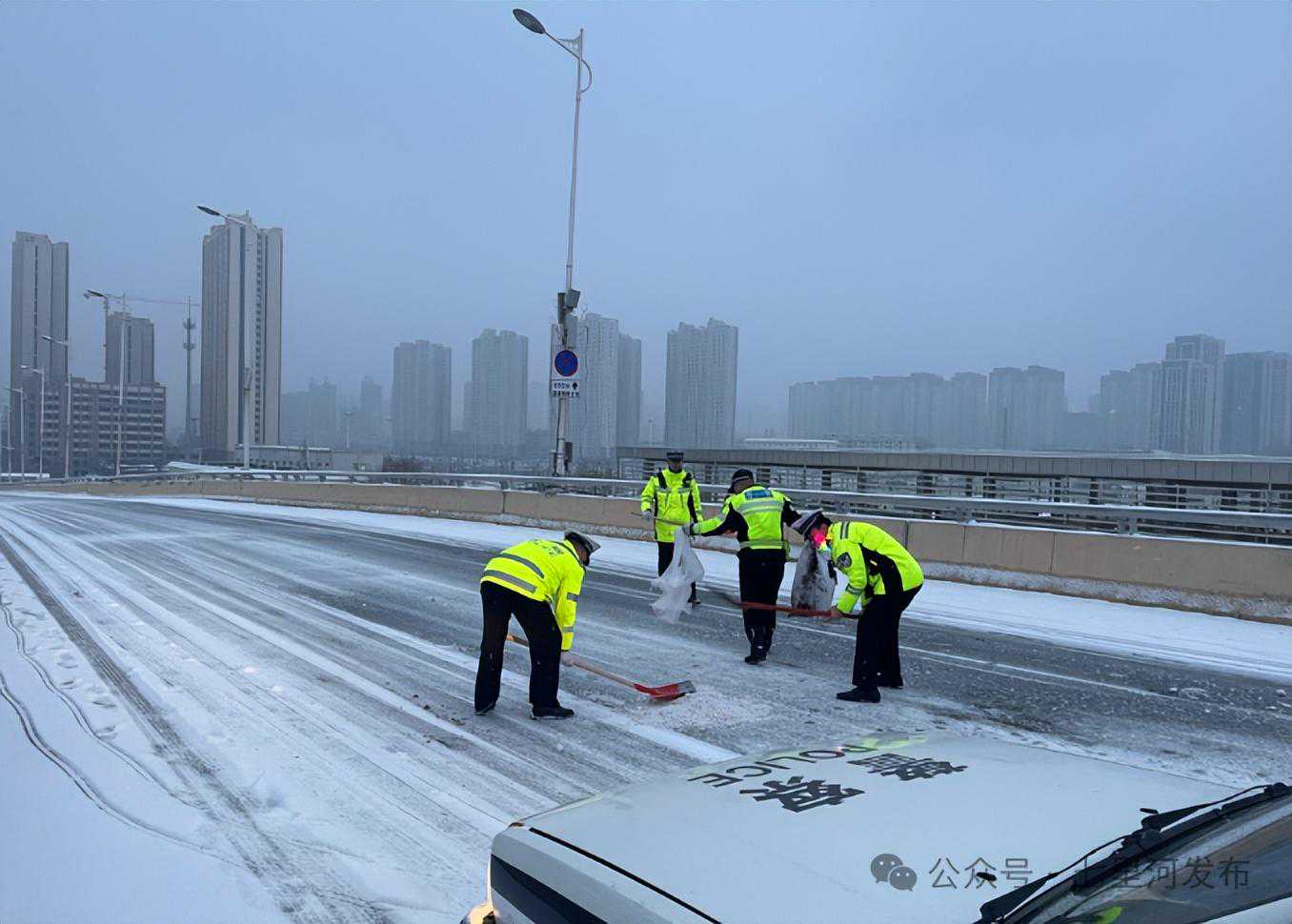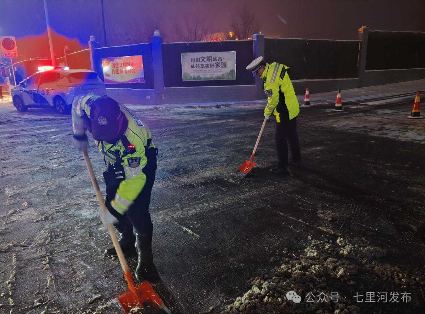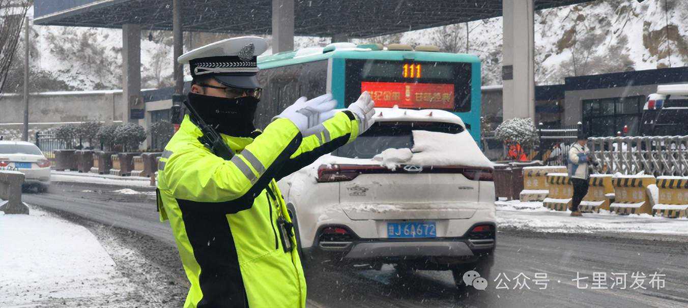 在人们迎接这白色浪漫的同时,还有一些人在默默忙碌着。城市的重点路段、陡坡、交叉路口、七里河区交警部门全员上岗,及时清理交通障碍,保障交通畅通。他们在寒风中指挥交通,利用喊话器、警灯和警笛等设备提醒司机降速慢行,控制车距,引导大家安全驾驶。同时,加大对国省道、乡镇道路等重点路段的巡逻频率,及时发现和清除道路交通安全隐患,确保群众安全出行。