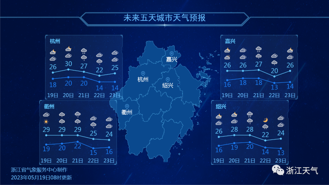 据气象台最新预测,今明两天以多云天气为主,气温又将逐渐升高。但周日(21日)开始,新一轮强降水来袭,全省阴有阵雨或雷雨,部分中到大雨,浙西地区局部暴雨,有雷雨地区局部伴有短时暴雨(最大小时雨强20~40毫米),7~9级雷雨大风和雷电,这轮强降水整体来看会持续两天,22日(周一)夜里才会陆续雨止。22日前后有一次冷空气影响过程,气温将明显降低,22-23日最低气温只有14~16℃左右。25日之后我们的老朋友“副热带高压”要回来了,夏天的主旋律回归,气温将再次回升。