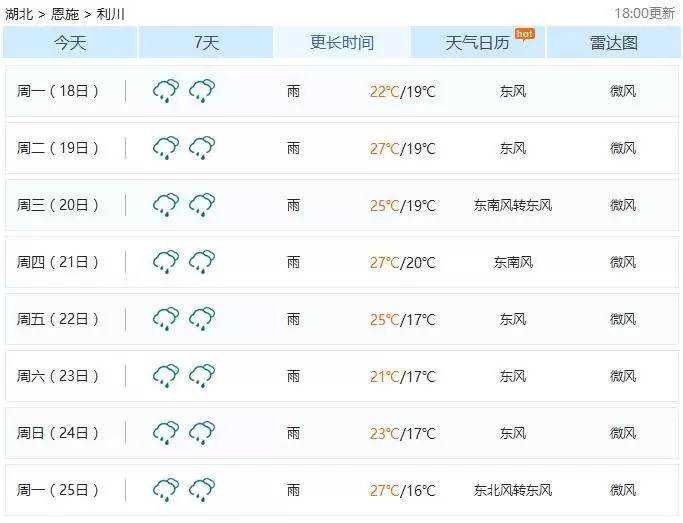 天气预报显示利川未来几天的天气情况: