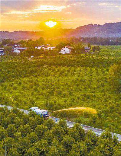 8月15日清晨,四川省广安市广安区大安镇柠檬产业园区,洒水车沿路浇水抗旱。张国盛摄(影像中国)