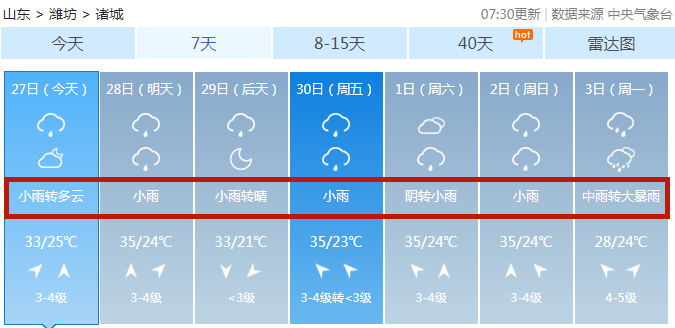 27日夜间到28日白天,天气多云转阴有雷雨或阵雨,南风3~4级,雷雨时阵风8~10级,最低气温24℃,最高气温35℃。