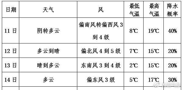 全省多云。最高温度:全省14℃左右;最低温度:本省东部地区0~1℃,其他地区4℃左右。全省偏南风4级左右。