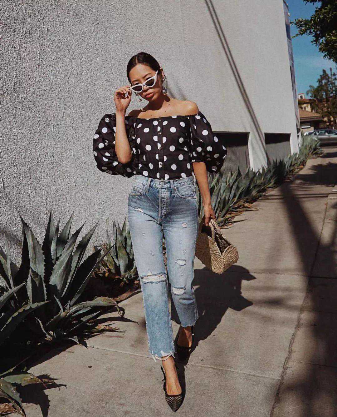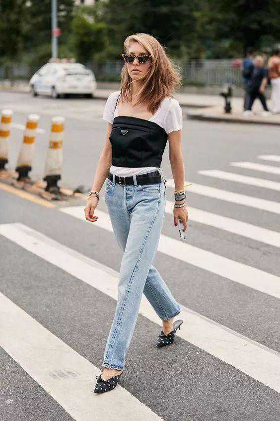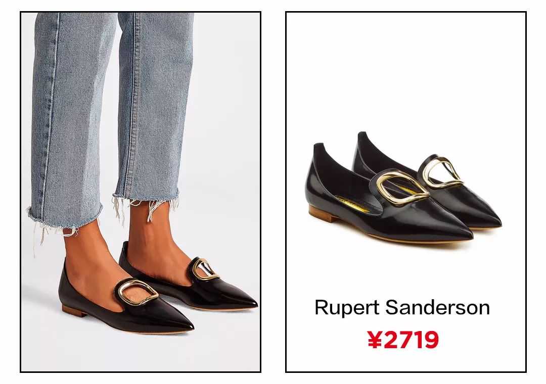 平底尖头鞋是最好搭配的了。只需要把平时选择穿小白鞋的look换成尖头鞋就好啦。比如配个高腰牛仔裤。