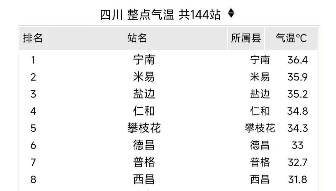 4月7日下午,红星新闻查询四川省公共气象服务网发现,当日17时,四川整点气温144站排名显示,四川的高温天气前十全部集中在攀西地区,多地气温已突破35℃。