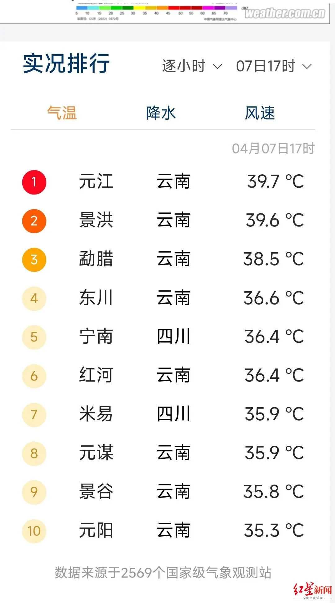 记者查询中国天气网发现,4月7日17时,全国高温榜前十,云南占八个,四川占两个。其中,云南元江达39.7℃,高居榜首。四川宁南气温36.4℃,排名第五,四川米易气温35.9℃,排名第七。