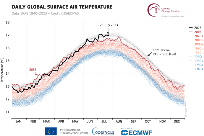 这次动人心弦的洪水也让许多人开始意识到气象异常的事实。2023年7月的一条新闻报道,地球表面以上2米的全球平均气温在7月3日达到17.01℃,创下纪录,首次突破17摄氏度。这一现象接踵而至,英国国家气象局宣布的2023年6月是英国有记录以来最热的月份。