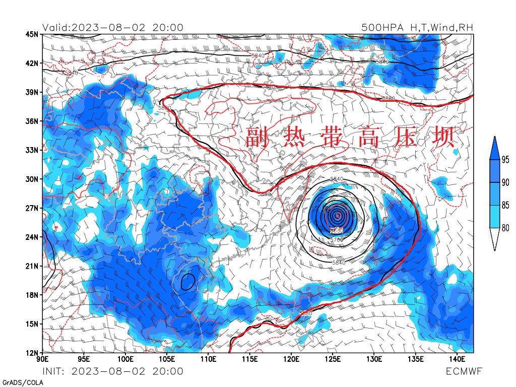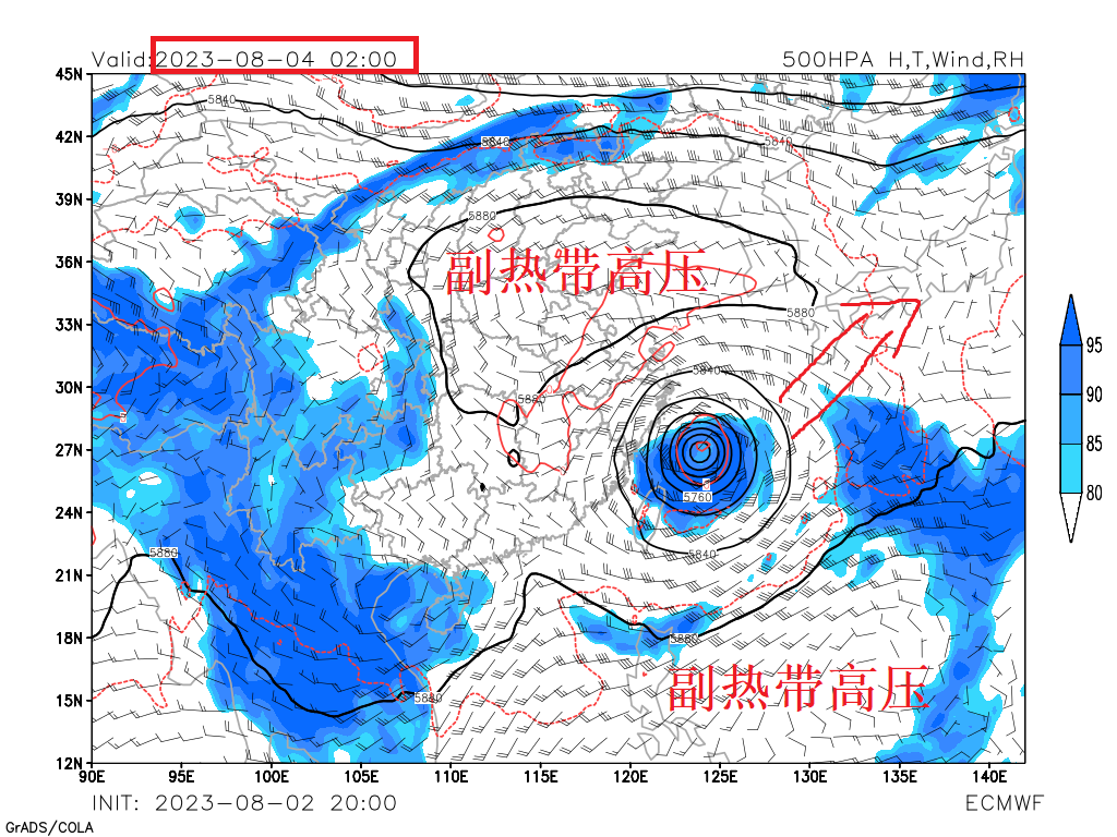 我们可以看到台风“卡努”被副热带高压三面包围,甚至可以说是“十面埋伏”,西北面、北面、东面、南面都是副热带高压的势力范围,有一种被“包饺子”的感觉。