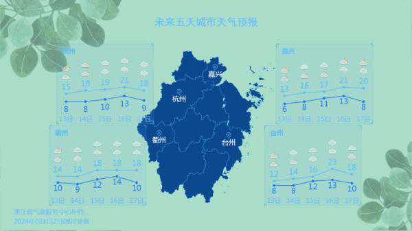 后天(14日)起全省云系增多,15日开始雨水又要来报到,一直到17日,杭州雨水增多,以阵雨为主,气温也不低,白天最高气温在20℃以上。所谓“一场春雨一场暖”,说的就是这个时候。
