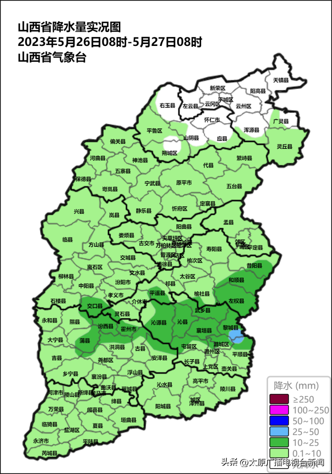 5月26日08时至27日08时,太原、阳泉、长治、晋城、晋中、运城、忻州、临汾和吕梁的全域,大同和朔州的局部共103个县(市、区)出现降雨,降水量在0.1~26.8毫米之间,黎城最大。其中,黎城在25毫米以上(大雨),晋中、长治、吕梁、临汾有12个县(市、区)在10~25毫米之间(中雨)。