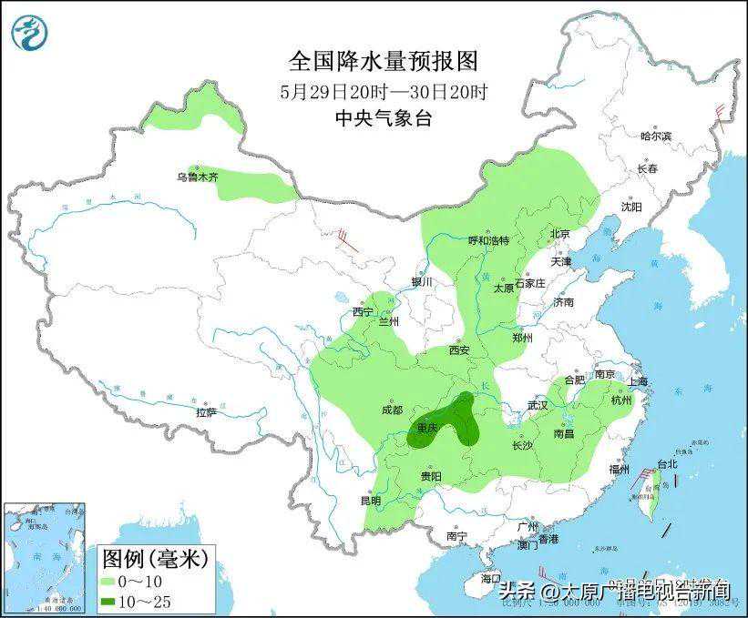 5月29日20时至30日20时,新疆北部、西北地区东部、华北西部、江汉西部、江南、西南地区北部和东部等有小到中雨。内蒙古西部、黑龙江东部等地部分地区有4~6级风。台湾海峡、台湾以东洋面、巴士海峡将有6~7级、阵风8级的风(见图4)。
