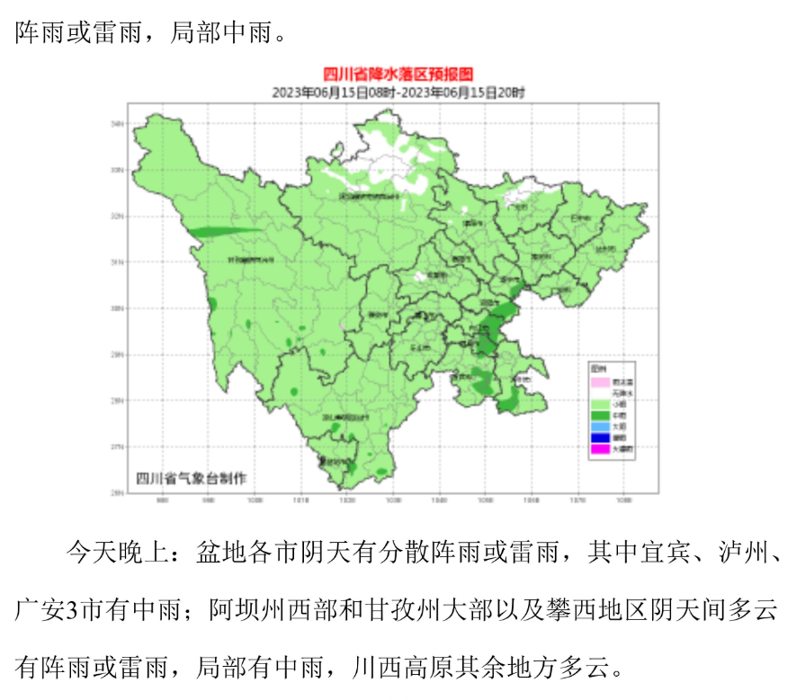四川省气象台最新天气预报显示,未来三天,盆地阴天有阵雨或雷雨,其中南部、中部和东北部有中雨,局地大雨到暴雨;川西高原和攀西地区多阵雨或雷雨,部分地方有中到大雨。