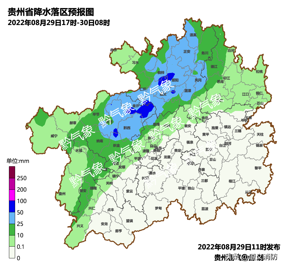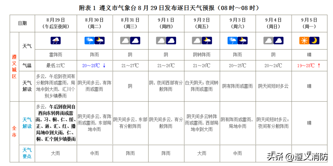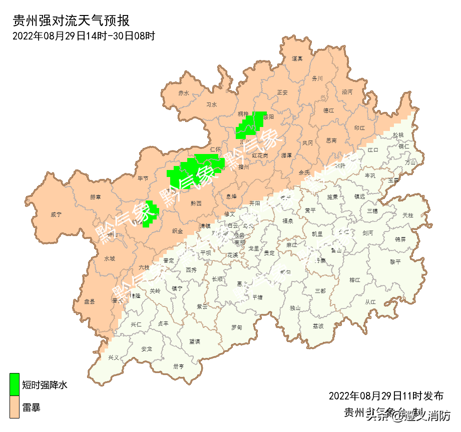 今天傍晚到夜间,省的西部、北部地区多云转阴天有阵雨或雷雨,局地伴有雷暴大风、短时强降水、冰雹等强对流,其中,毕节市大部、遵义市大部、铜仁市北部和西部、六盘水市东部、黔西南州北部局地中到大雨,个别乡镇暴雨或大暴雨,其余地区多云;明天白天到夜间,省的南部、东部地区多云转阴天有阵雨或雷雨,局地中雨,个别乡镇大雨或暴雨,铜仁市东南部、黔东南州东北部有35℃以上高温,其余地区阴天间多云有分散阵雨或雷雨,气温下降4-8℃;31日白天,省的西部阴天有阵雨,其余地区阴天间多云,南部、东部地区气温下降2-8℃;31日夜间到9月1日白天,省的西部和南部地区阴天间多云有阵雨或雷雨,其余地区阴天间多云。