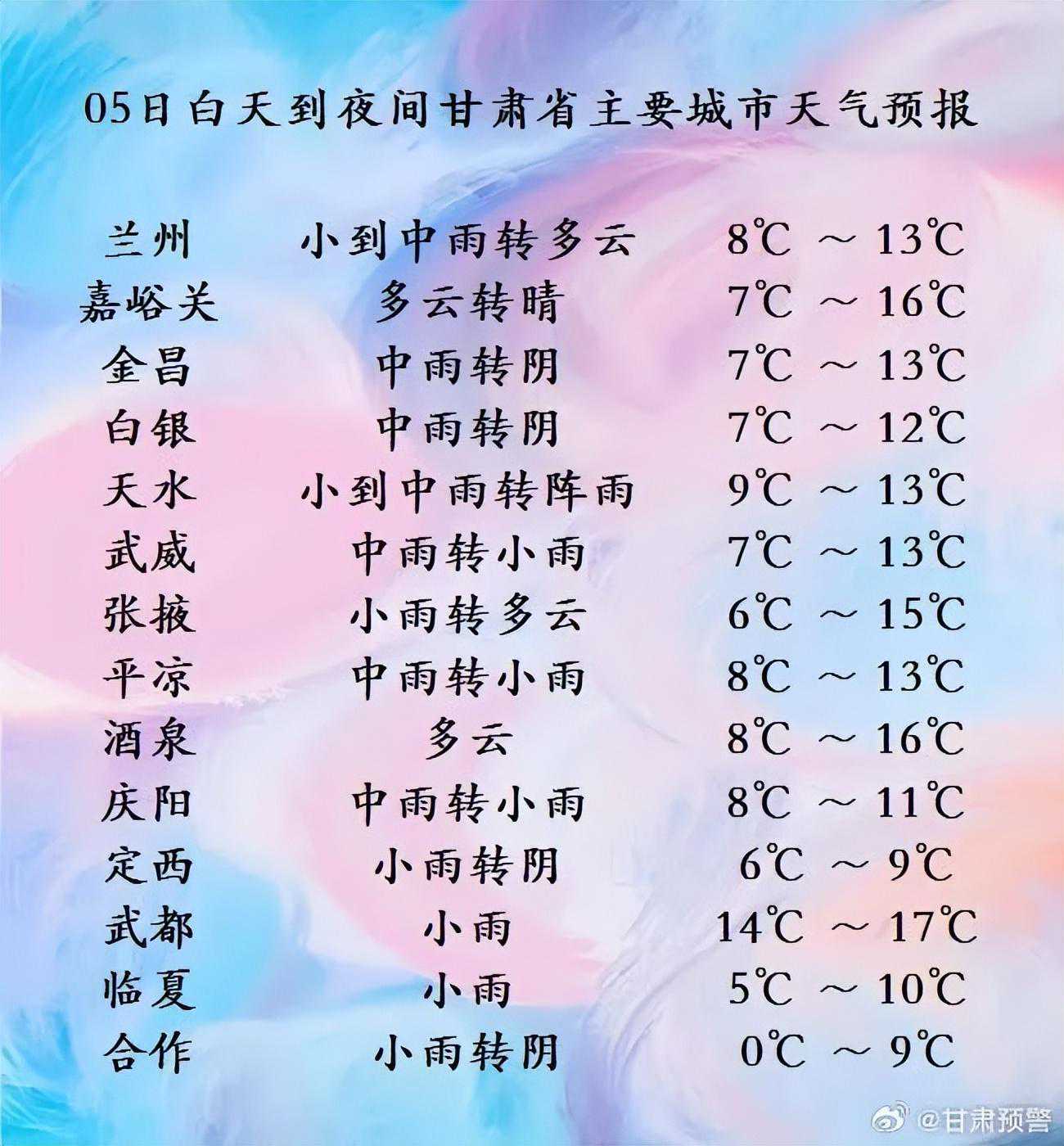 未来三天,甘肃雨雪天气将持续发展,多地将出现明显降水,部分地区雨量可达大雨、局地暴雨,西部等地有中到大雪或雨夹雪,局地有暴雪或大暴雪,将给返程交通安全带来不利影响。
